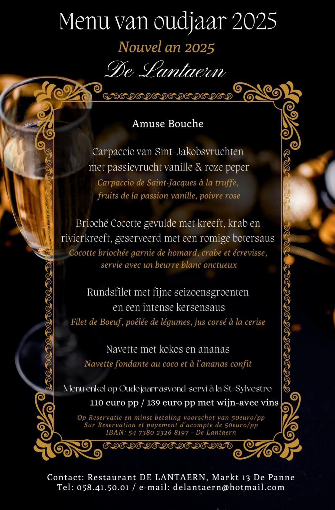Een lunchmenu van maandag tot zaterdag aan € 23,- en vaste menu's en menu's vanaf € 29.